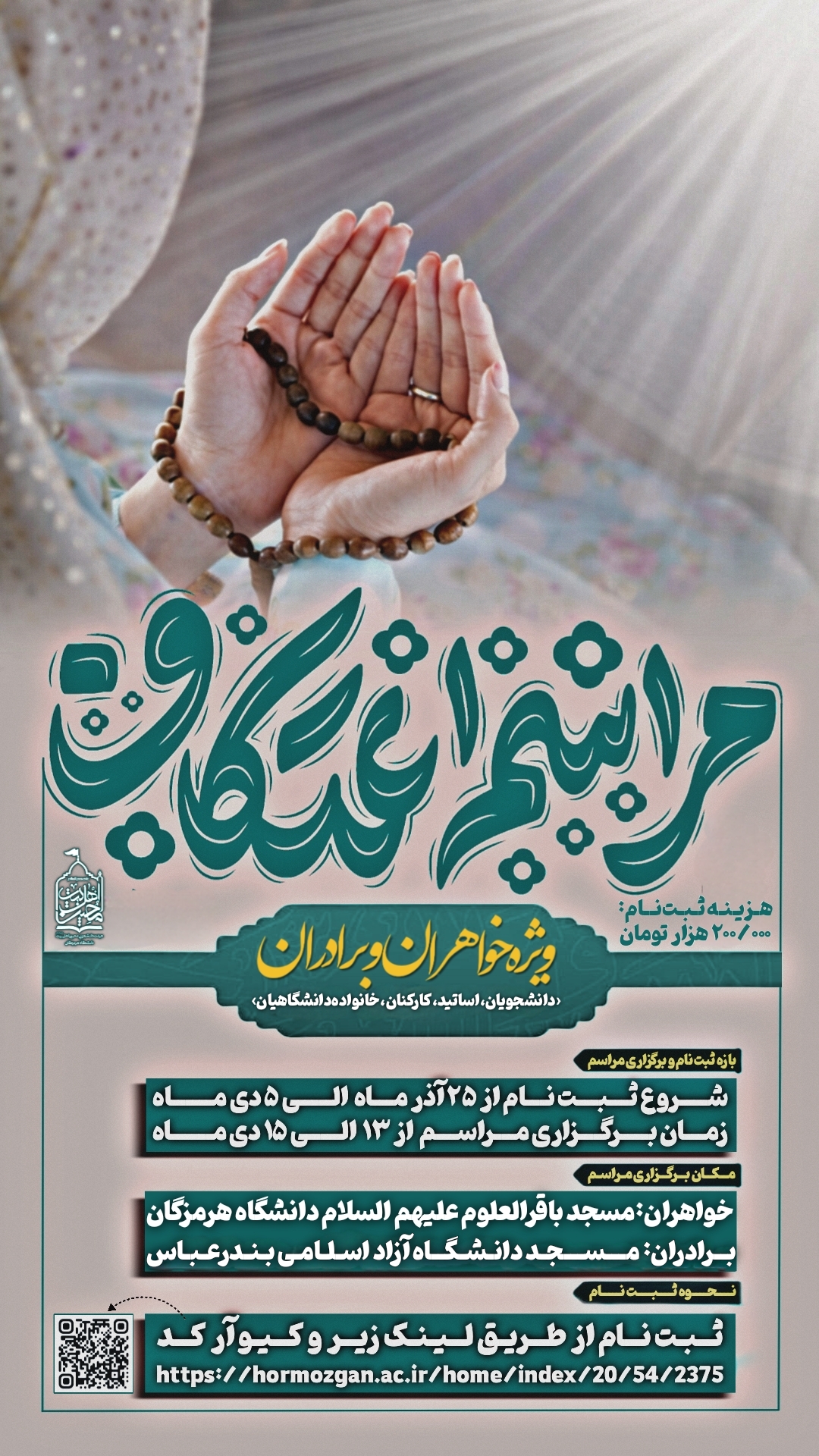 ثبت‌نام اعتکاف دانشجویی ویژه دانشگاهیان دانشگاه هرمزگان آغاز شد. این مراسم معنوی از ۱۳ تا ۱۵ دی‌ماه فرصتی ارزشمند برای خودسازی، آرامش و تقرب الهی است.