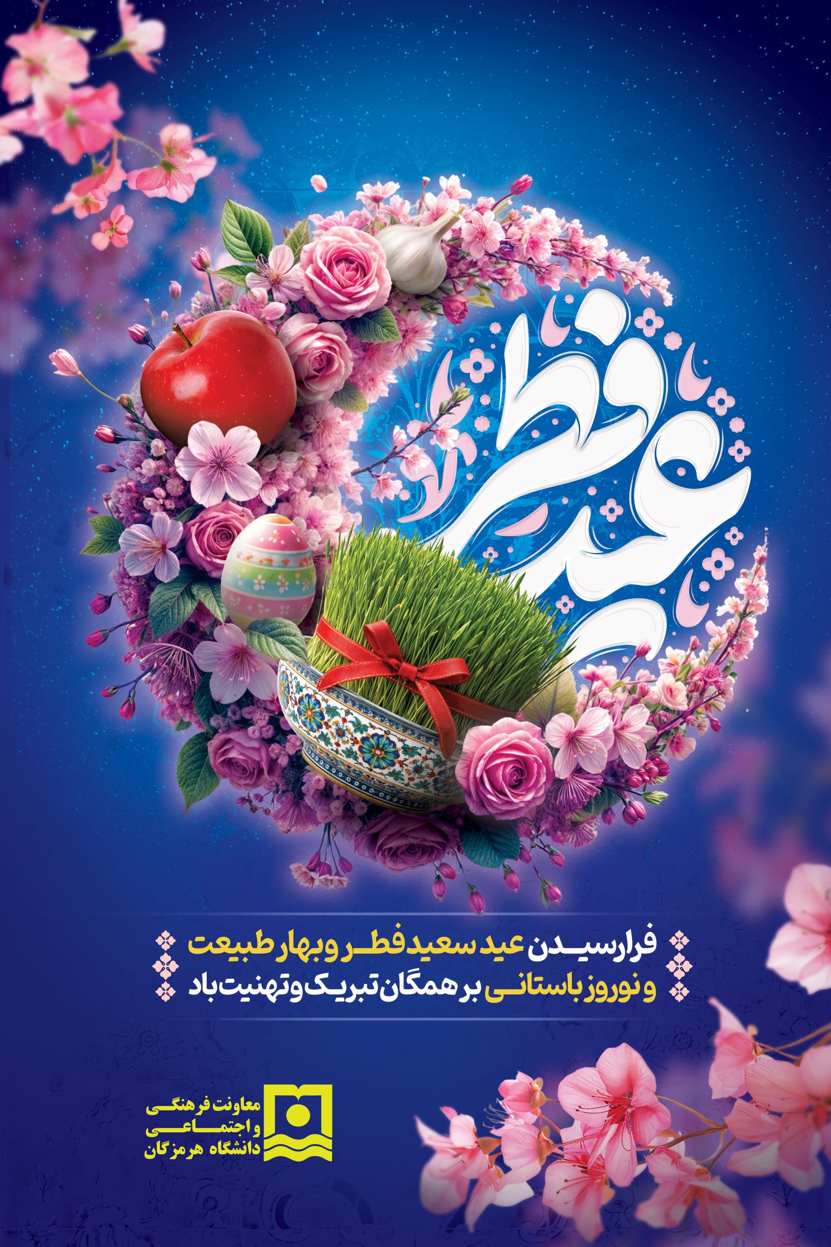معاونت فرهنگی و اجتماعی دانشگاه هرمزگان، در آستانه این تقارن مبارک، ضمن تبریک صمیمانه فرا رسیدن نوروز ۱۴۰۵ و عید سعید فطر به اعضای هیات علمی، دانشجویان، کارکنان و خانواده بزرگ دانشگاه هرمزگان، برای همگان سالی سرشار از سلامتی، موفقیت، آرامش و پیشرفت آرزو می‌کند.