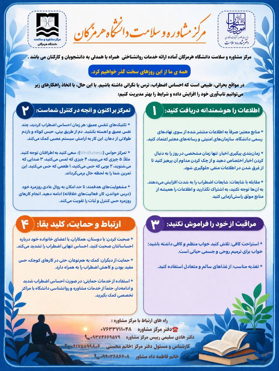🗳️انتخابات کانون همیاران سلامت دانشگاه هرمزگان روز دوشنبه ۱۹ آبان‌ماه ۱۴۰۴ با حضور جناب آقای دکتر هادی سلیمی (رئیس مرکز مشاوره، سلامت و سبک زندگی) به‌صورت حضوری در سالن همیاران مرکز مشاوره دانشگاه هرمزگان برگزار گردید.